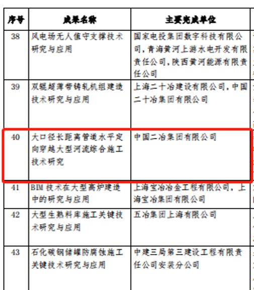4月12日,中國安裝協(xié)會公布《關(guān)于公布2022年中國安裝協(xié)會科學(xué)技術(shù)進(jìn)步獎(jiǎng)評選結(jié)果的通知》的正式文件。中國二冶申報(bào)的《大口徑長距離管道水平定向穿越大型河流綜合施工技術(shù)研究》首次斬獲中國安裝協(xié)會科學(xué)進(jìn)步獎(jiǎng)二等獎(jiǎng)。