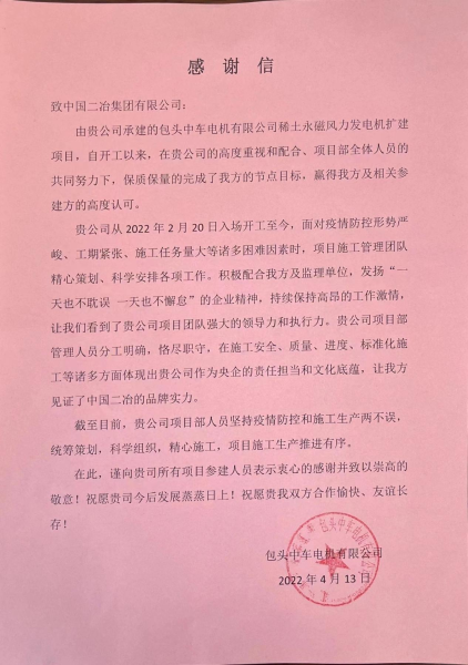 4月13日,中國二冶收到來自包頭中車電機有限公司感謝信,對中國二冶在包頭中車稀土永磁風力發(fā)電機擴建項目工程取得的成績表示肯定,對中國二冶參與項目工程建設全體人員兢兢業(yè)業(yè)、敢打敢拼的奮斗精神予以肯定,對在疫情形勢下保障該項目施工節(jié)點所做出的卓越貢獻表示感謝。