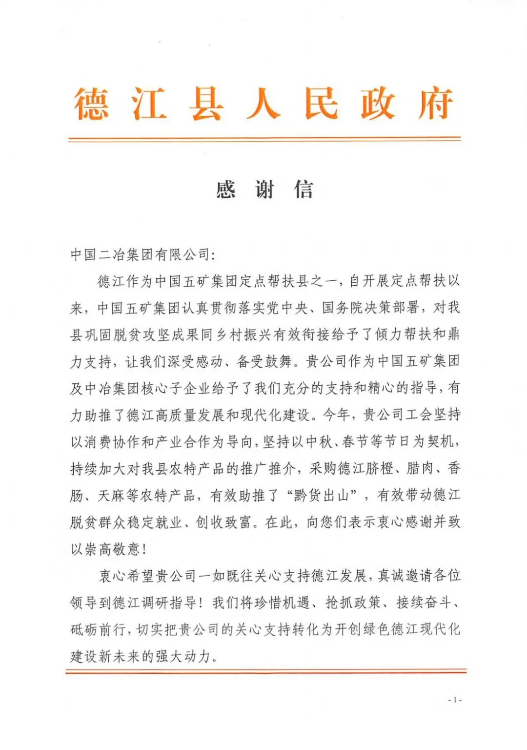 1月20日,中國(guó)二冶收到貴州省銅仁市德江縣人民政府感謝信,對(duì)中國(guó)二冶在助推“黔貨出山”,帶動(dòng)德江脫貧群眾穩(wěn)定就業(yè)、創(chuàng)收致富方面作出的貢獻(xiàn)表示感謝。