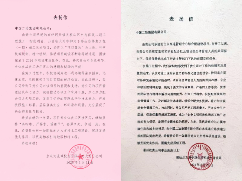 兩封表揚(yáng)信真摯誠懇、情真意切,是對中國二冶高質(zhì)量施工管理和匠心鑄造精品工程的一致認(rèn)可。下一步,中國二冶將繼續(xù)發(fā)揚(yáng)“彰顯央企擔(dān)當(dāng),鑄就永恒精品”的企業(yè)使命,圓滿完成后續(xù)各項(xiàng)工作任務(wù),確保項(xiàng)目高質(zhì)量完美履約,為公司與業(yè)主交上一份滿意答卷。